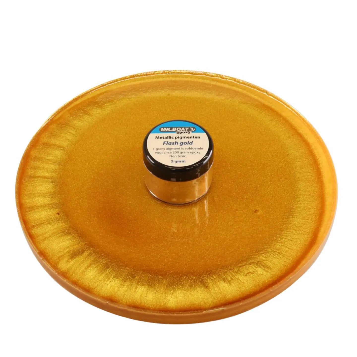 Breng je epoxy creaties tot leven met Flash Gold, een luxe felgoud parelmoer pigmentpoeder met een schitterende metallic glans. Dankzij de uitzonderlijk hoge kleurdekking heb je slechts 5 gram nodig per 1000 gram epoxy. Dit pigment trekt geen vocht aan, waardoor het zeer lang houdbaar blijft.